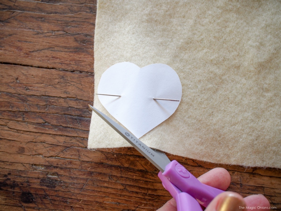 Шаг 1. На бумаге нужно нарисовать сердечко высотой примерно 4-5 см. Выкройку вырезают и прикалывают к куску красного фетра с помощью булавок. Ножницами вырезают сердце из фетра и повторяют эту процедуру 4 раза. В итоге получатся 4 лепестка для будущих тканевых маков.