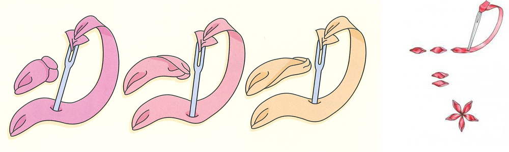 Японский шов. Ленту на лице раскладывают и втыкают иглу в неё же выводя на изнаночную сторону. Таким образом создают листочки.