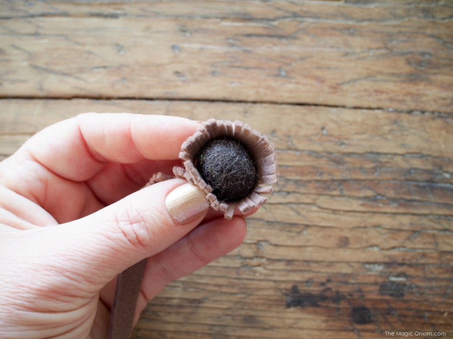 Шаг 4. Войлочный шар необходимо обернуть полученной бахромой и лишнее отрезать. Силикон из пистолета наносится по низу ленты там, где нет бахромы. После чего деталь оперативно прижимается по кругу войлочного шара и закрепляется.