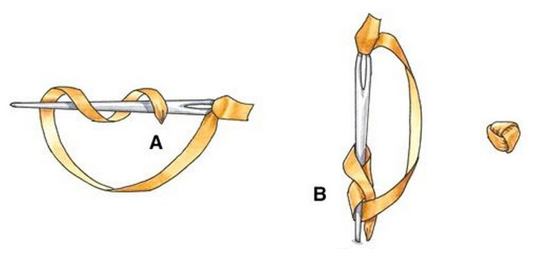 Французский узелок. Подойдёт для изображения бутонов. Иглу выводят на лицевую сторону и обматывают лентой, затем делают прокол рядом с предыдущим и возвращают иглу наизнанку.