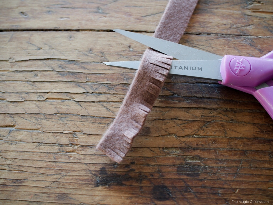 Шаг 3. Из коричневого войлока нужно вырезать полоску длиной 6 см и шириной 1 см. С помощью острых ножниц делаем на полученной детали надрезы по всей ее длине. Каждая засечка должна доходить до середины войлочной ленты. В результате получится бахрома.