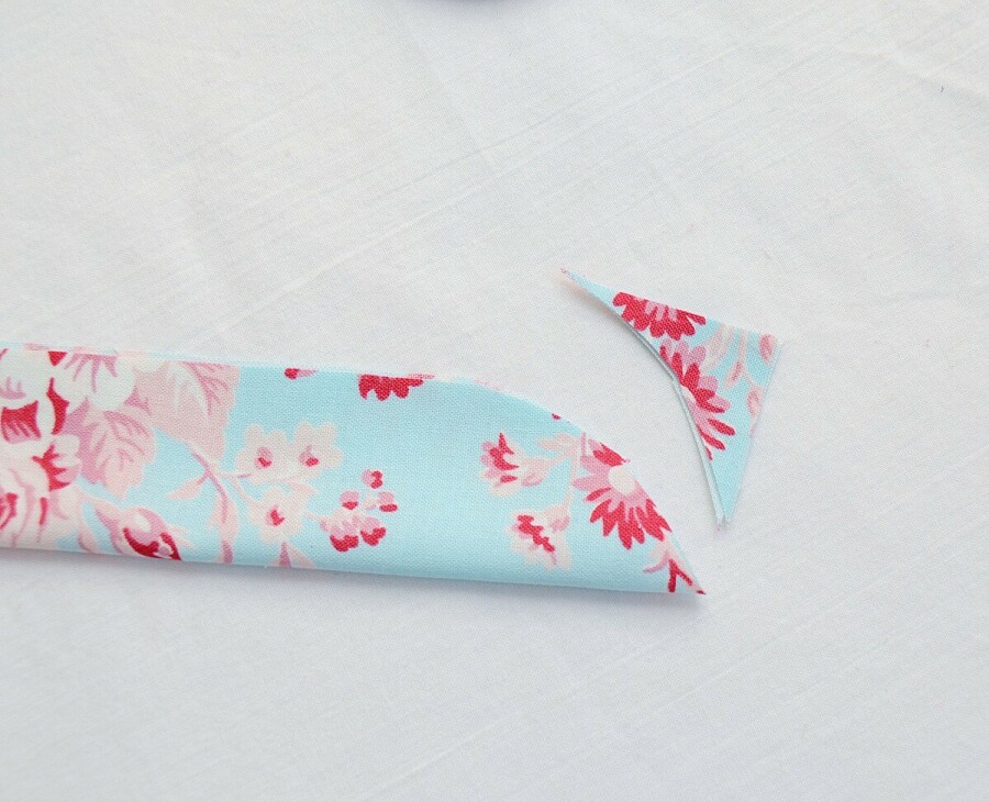 Полоску ткани сложите пополам вдоль изнанкой внутрь и скруглите уголки, как показано на фото.