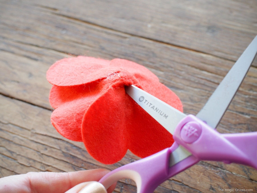 Шаг 6. С помощью острого конца одного из лезвий ножниц немного в стороне от центра цветка проделывается отверстие. Несмотря на то, что отверстие будет с задней части, сделать его нужно аккуратно, чтобы не повредить всю конструкцию и не пострадать самому.