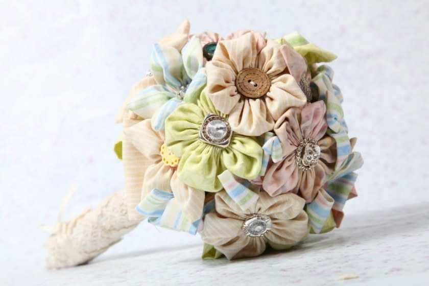Например, букет невесты можно изготовить из скрученных роз. Для этого понадобится лента 4-5 см, длиною 1,2 м. С одной стороны загибают уголок и скручивают в трубочку. До конца длины обматывают сердцевину лентой, перекручивая её, на небольших промежутках, с лица наизнанку и обратно. Второй край прячут под последний лепесток, и закрепляют конструкцию прошив ниткой.