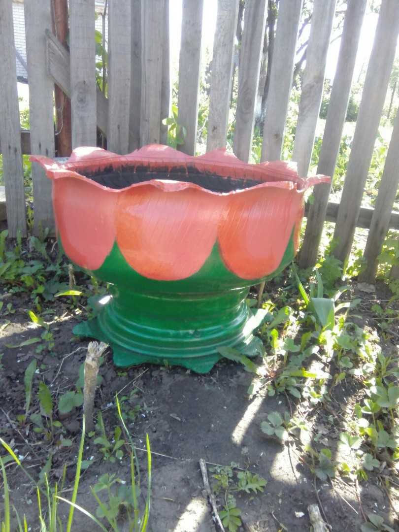 Оригинальная поделка из автомобильной покрышки в виде корзины для цветов