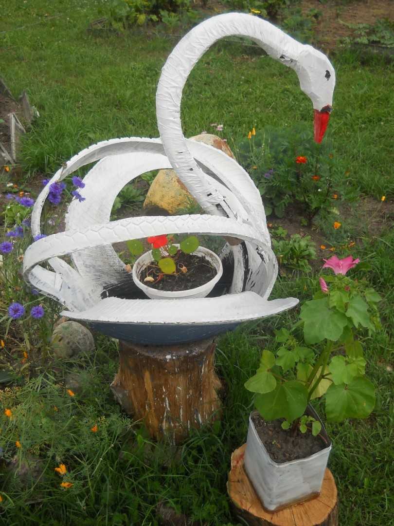 В итоге должна получиться лебедь, которого можно использовать в качестве клумбы. Помимо такого варианта, существуют и другие способы сделать эту фигурку.