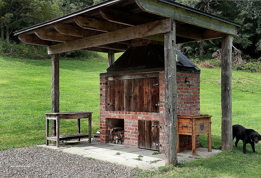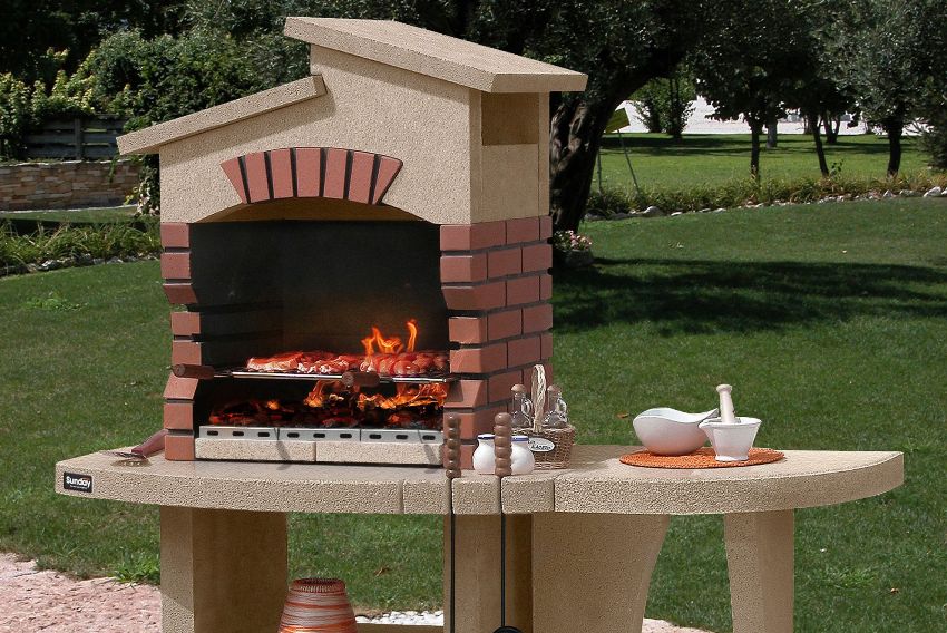 Также следует продумать наличие крыши. Существуют варианты с открытым и закрытым типом жаровни. Во втором случае конструкция печи для шашлыка из кирпича внешне напоминает камин. Преимущества подобного проекта очевидны, поскольку в случае дождя очаг будет защищен от осадков. Чтобы такая конструкция функционировала должным образом, обязательно придется обустроить дымоход.