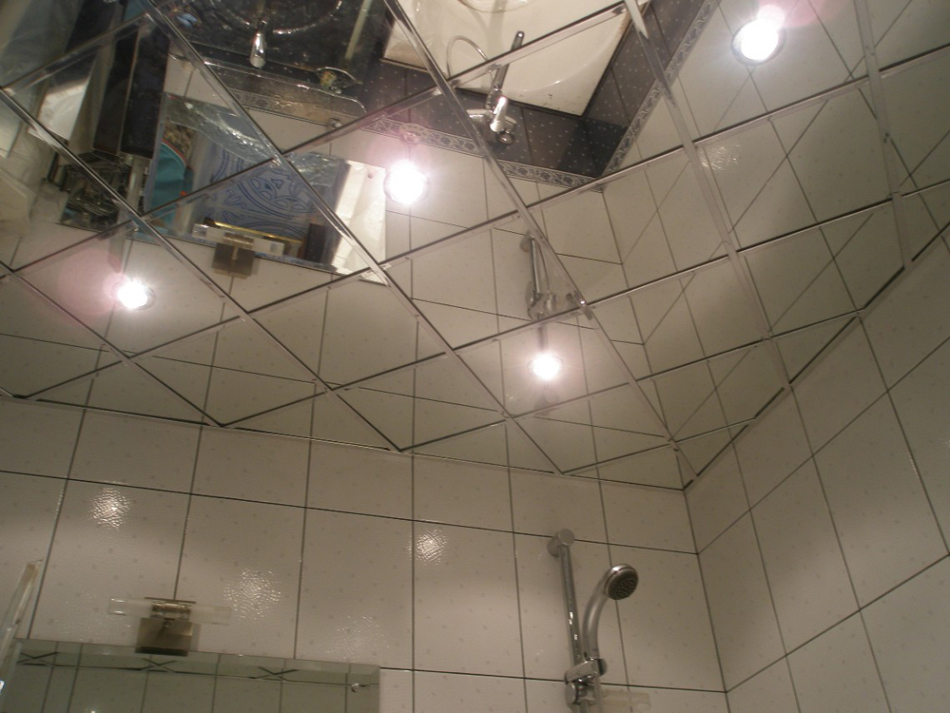 - Потолок с фацентом. Это вид зеркального покрытия тоже предусматривает монтаж прочного каркаса, но в отличие от предыдущего способа, плитки к нему будут крепиться при помощи специального клея
