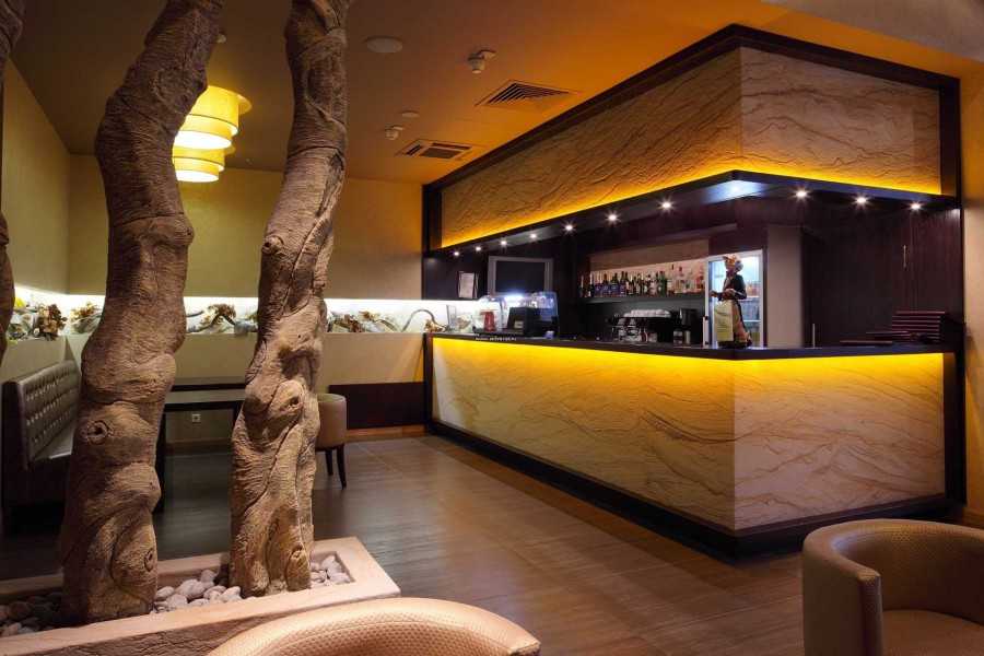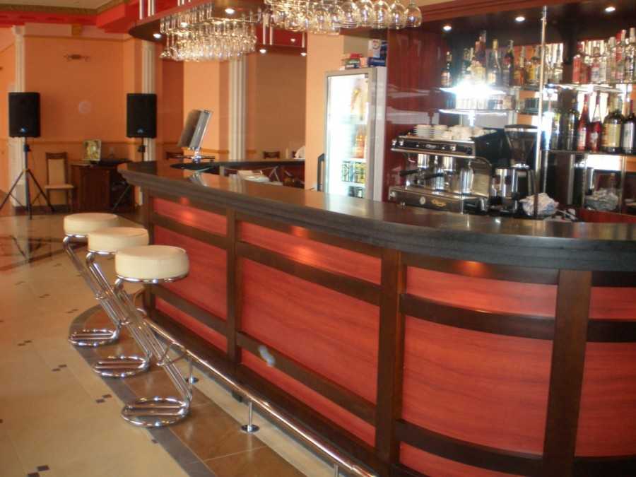 Лицом заведения выступает барная стойка. Часть посетителей проводит за ней много времени, общаясь с барменом. Из-за постоянных нагрузок столешницу делают крепкой: из камня, дерева или высокопрочного стекла. С обратной стороны стойки следует организовать удобную для обслуживающего персонала планировку. Идеальная высота прилавка составляет 105—120 см, глубина — 40—50. Стойку обставляют барными стульями. С их формой экспериментируют, если общее оформление ресторана позволяет. Удобство сидений — существенный момент, на неудобном стуле клиент долго сидеть не будет и, скорее всего, просто уйдет из ресторана. Основных дизайнерских решений для барной стойки есть всего два: деревянная конструкция и вариант из современных технологических материалов. Популярностью пользуются также тематические варианты.