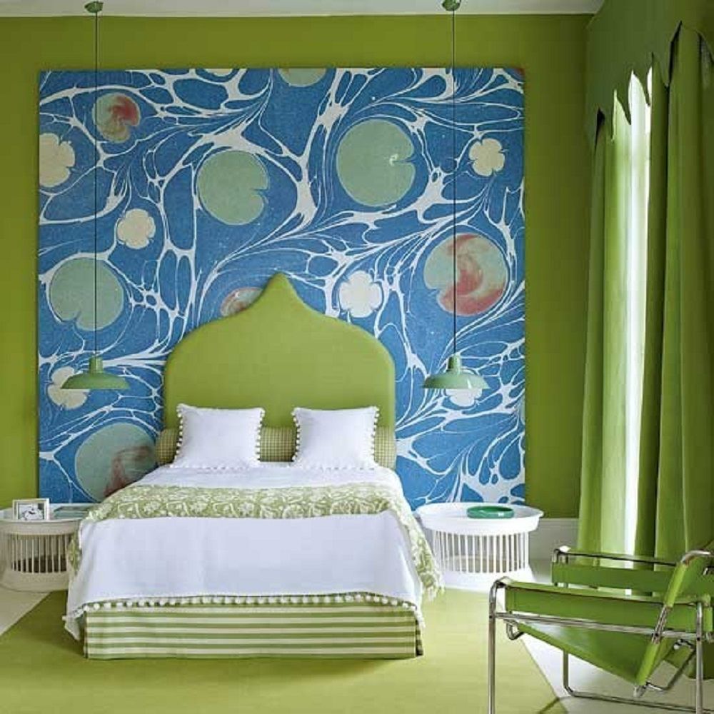 Свежая идея — имитация изголовья. Вы можете нарисовать, то что подходит в вашу спальню с помощью трафарета!