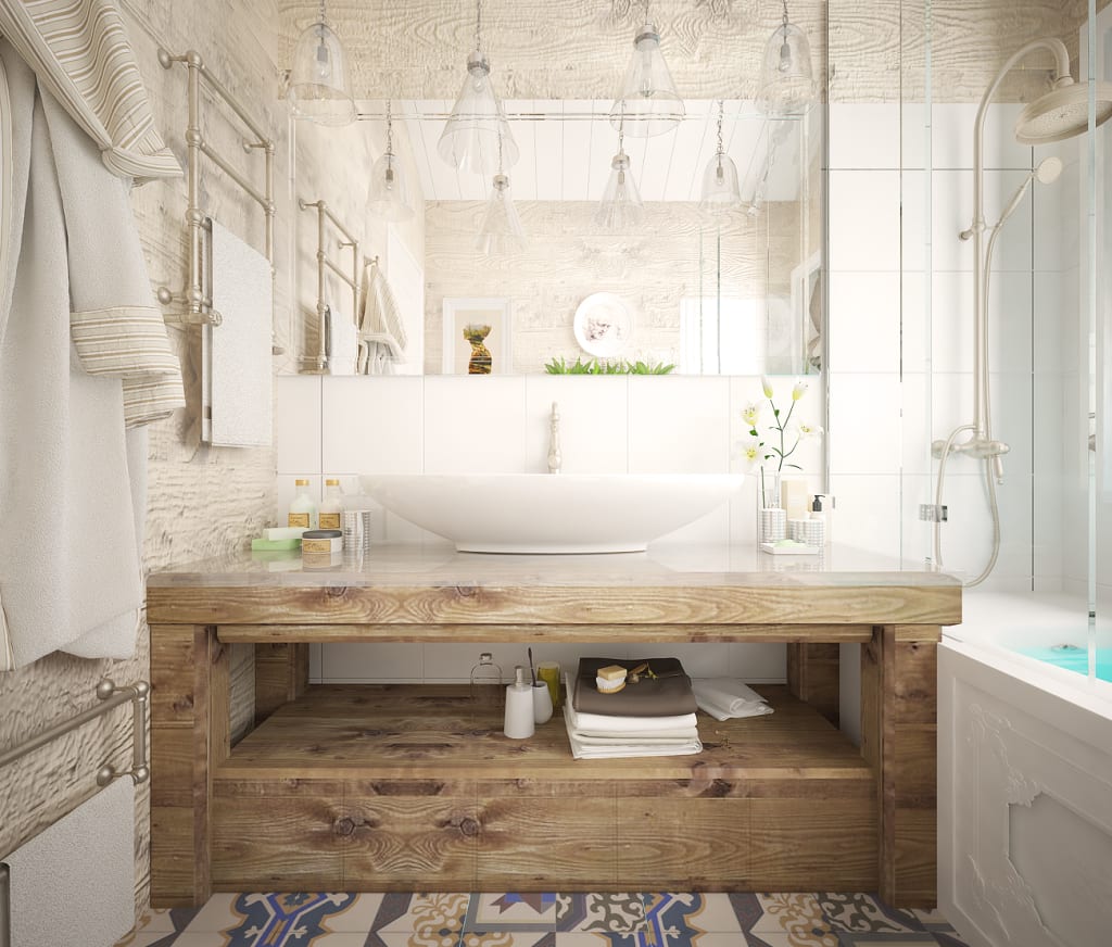 Деревянная мебель с сохранённым природным рисунком имеет эффект необработанного дерева. Именно такая расцветка идеально гармонирует со светлым интерьером и характерна для ванной в скандинавском стиле.