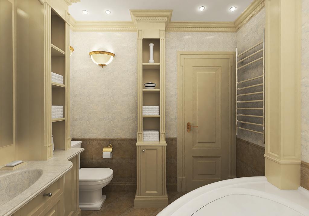 Выбирая, каким цветом покрасить ванную комнату, важно учитывать стиль помещения. Для классического интерьера подойдут золотистые, бежевые тона