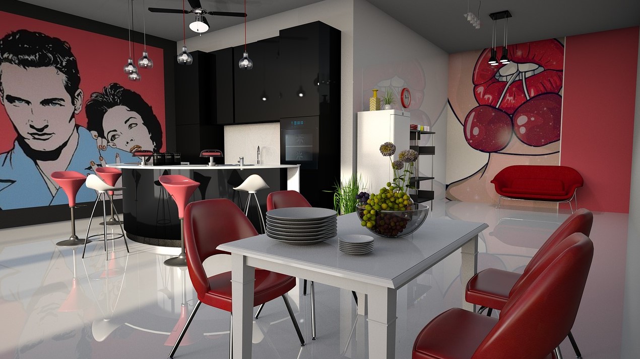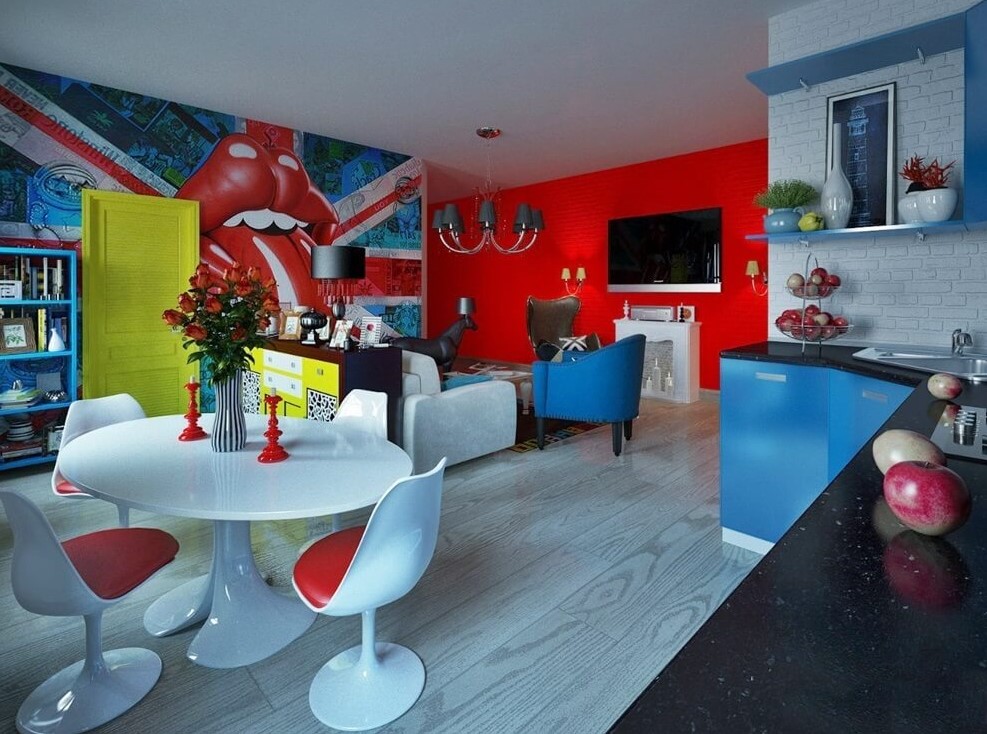 Если хочется подчеркнуть свой небанальный вкус, попробуйте оформить кухню в стиле поп-арт. Это игра на грани фола с контрастными цветовыми акцентами, и красный прекрасно подходит для решения подобных задач. Если часто результат получается крайне эклектичным, не стоит печалиться. Это в традициях стиля.