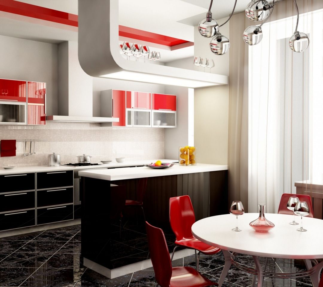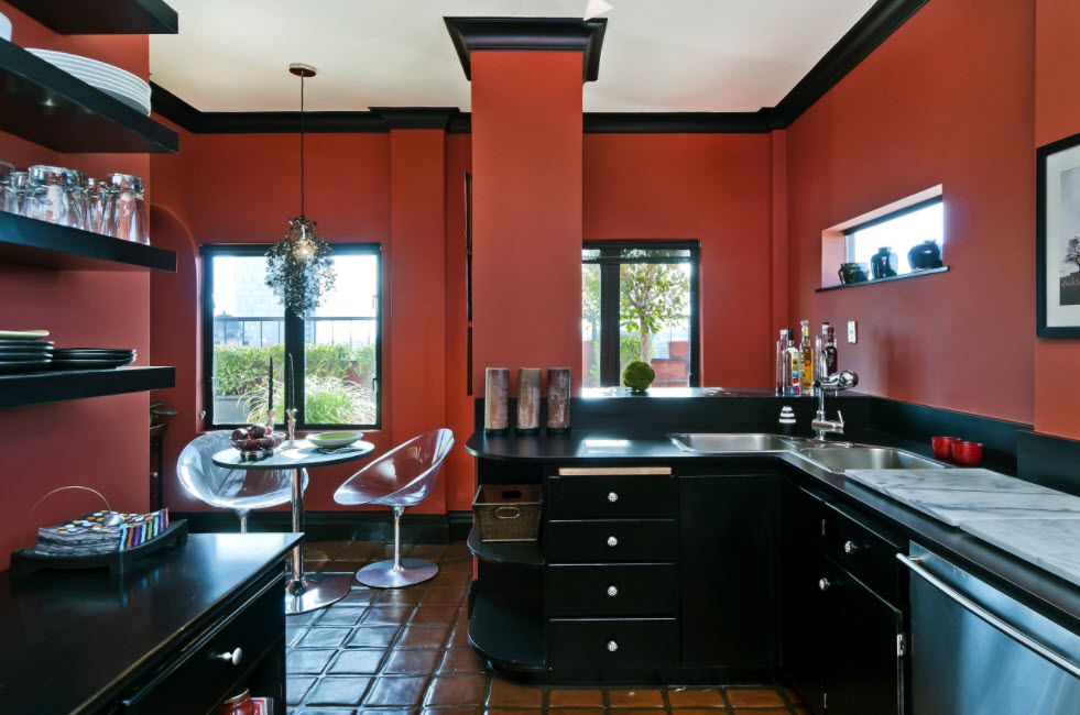 Существует много вариантов цветовых сочетаний красно-черных кухонных гарнитуров.