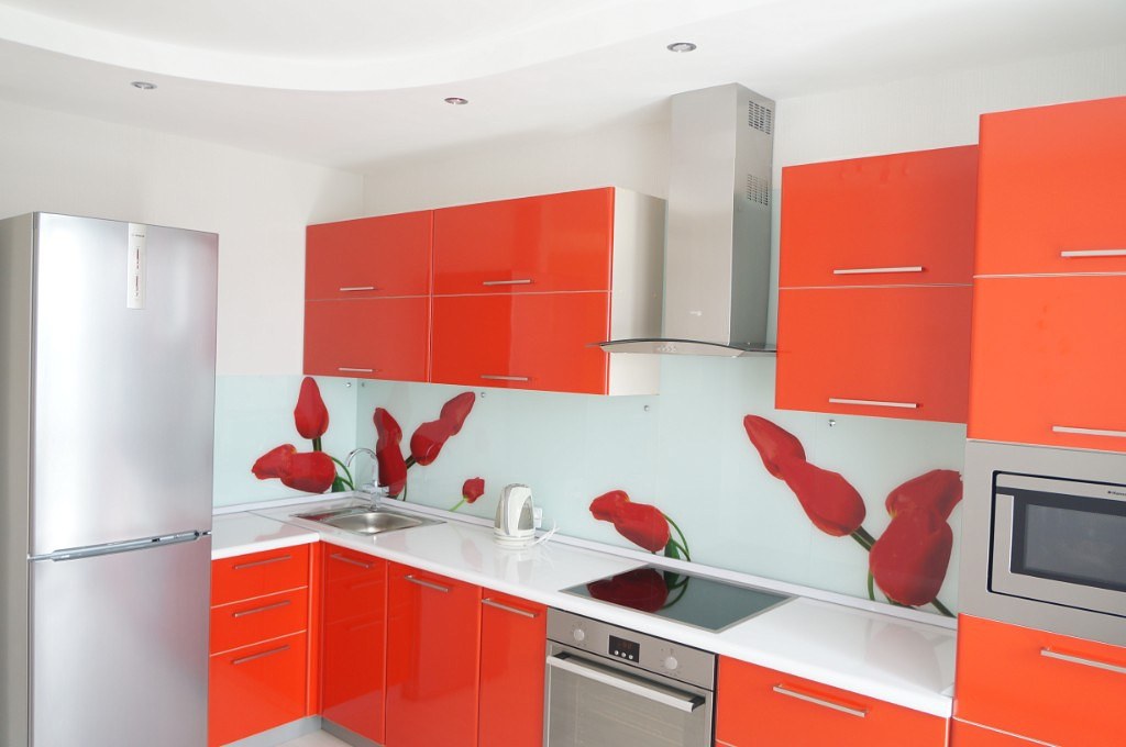 Свежести и живости дизайну красно-белой кухни придаст цветной фартук. Он может быть выполнен из любого материала – от мозаики до закаленного стекла. Очень стильно будет смотреться принтованный пластик и фотопечать.