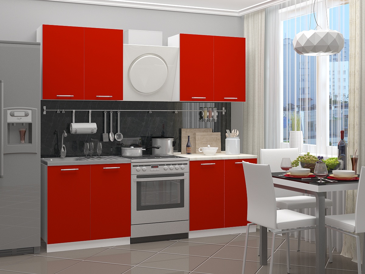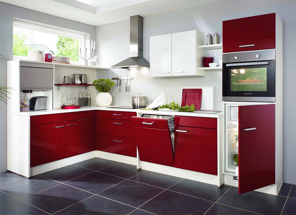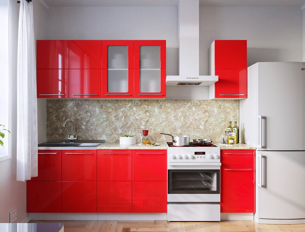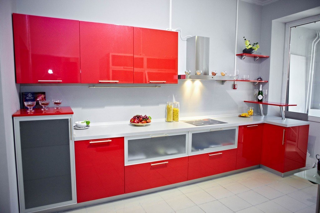 - Кухонная мебель разнообразных оттенков красного. Основное условие – отличный от основной отделки цвет.