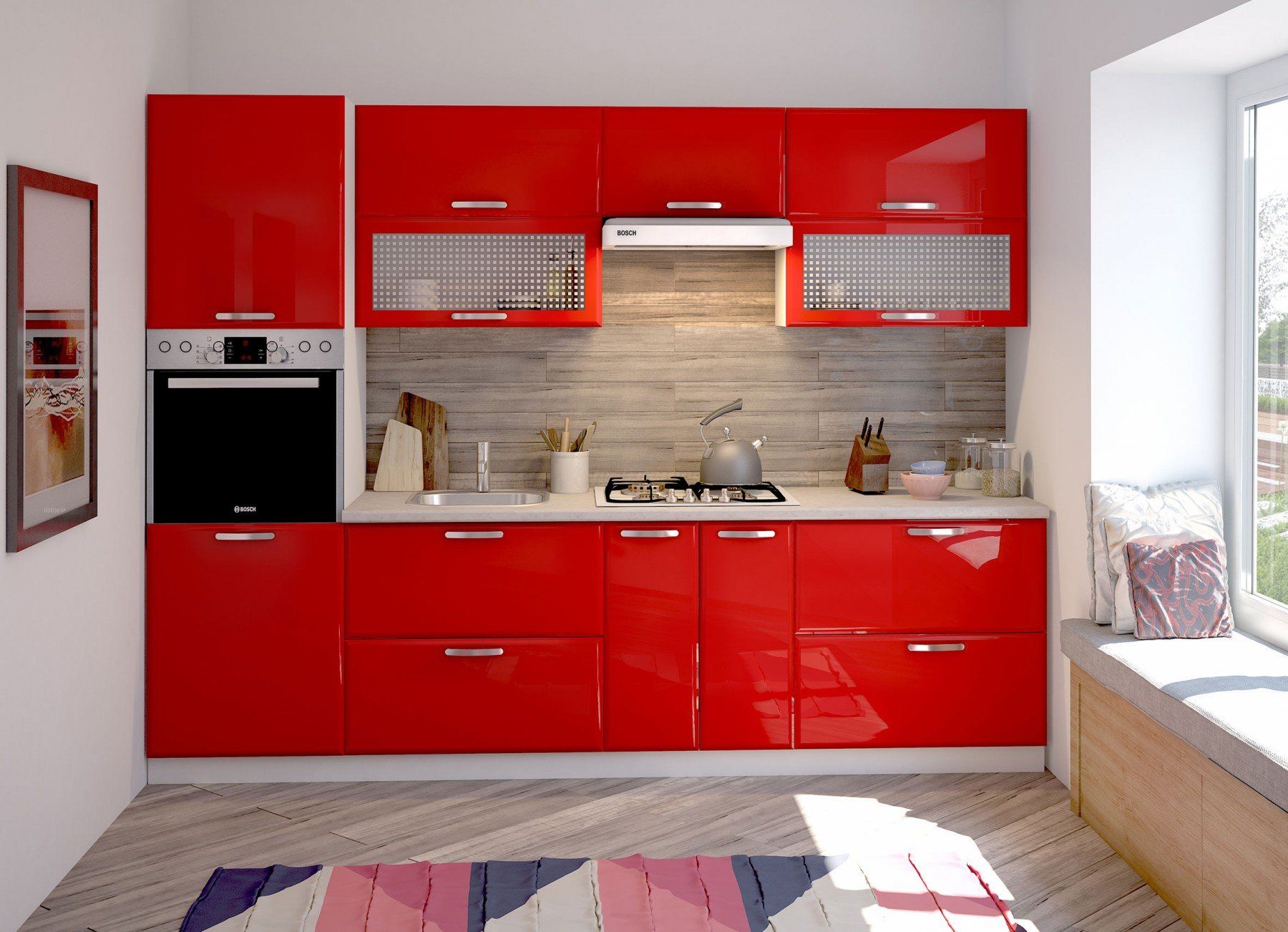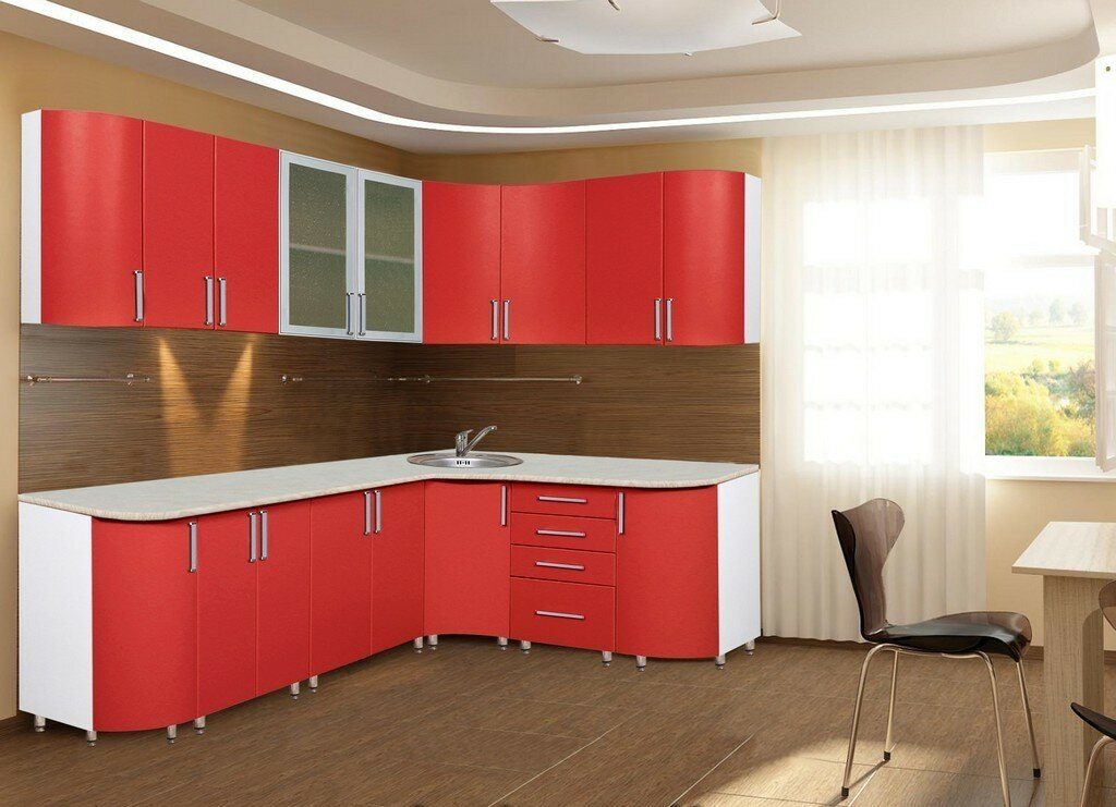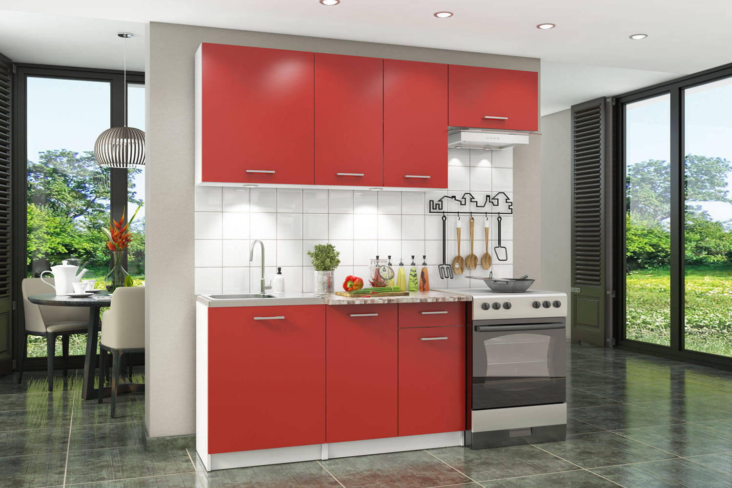 - Кухонная мебель разнообразных оттенков красного. Основное условие – отличный от основной отделки цвет.