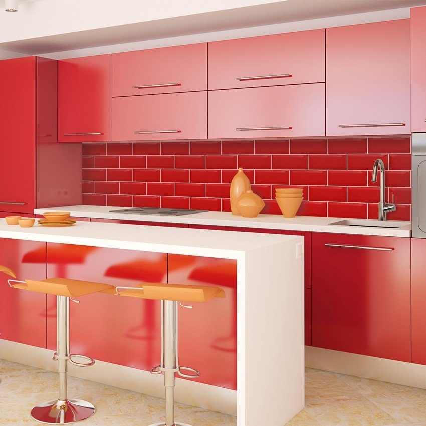 Кухня с красным плиточным фартуком и того же цвета акцентами на деталях: стильно, модно, молодежно.