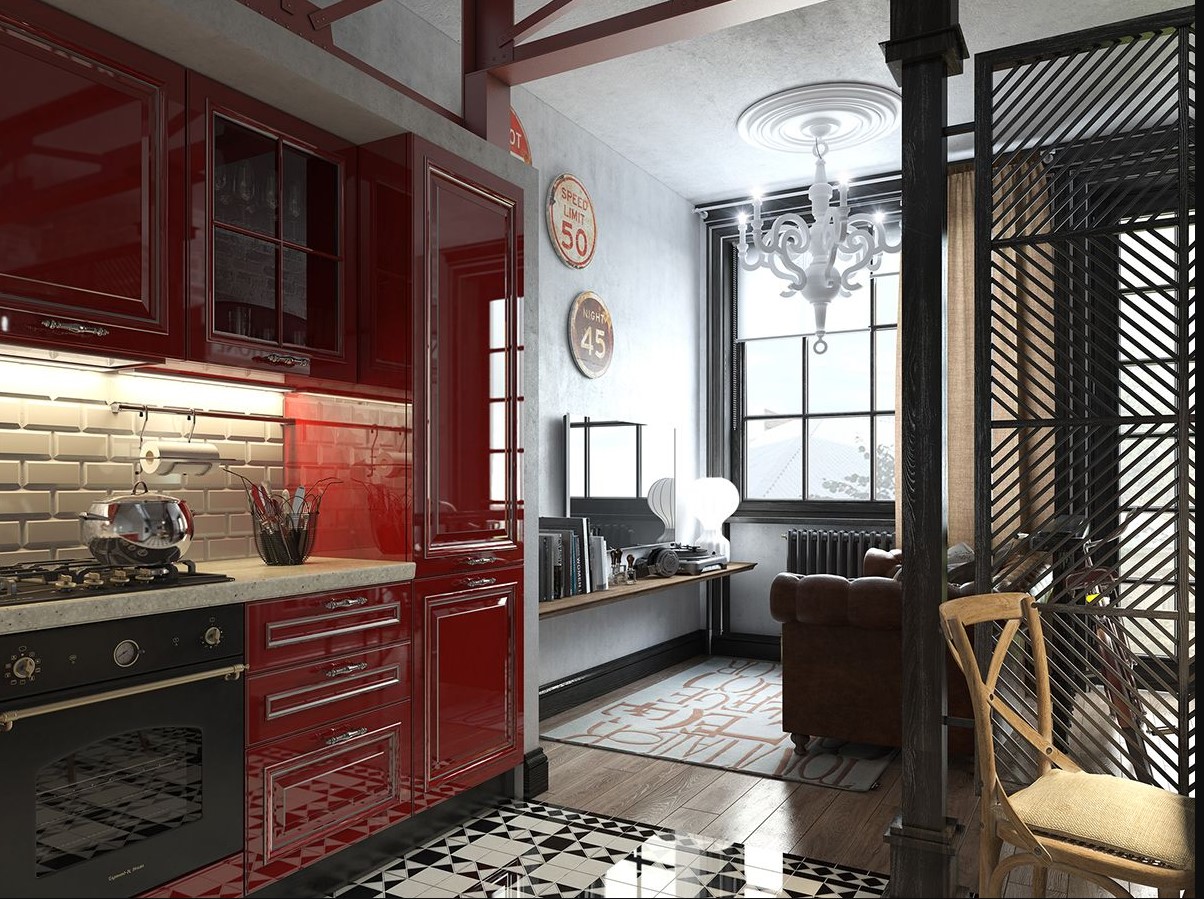 Пин-ап — еще один стиль, который невозможно представить без красного. Запоминающимся и нескучным интерьер кухни сделают яркая мебель, настенная и напольная плитка контрастных цветов, выложенная в шахматном порядке, кухонный текстиль с гороховым принтом и картины с обаятельными девушками-символами красоты тех далеких лет.
