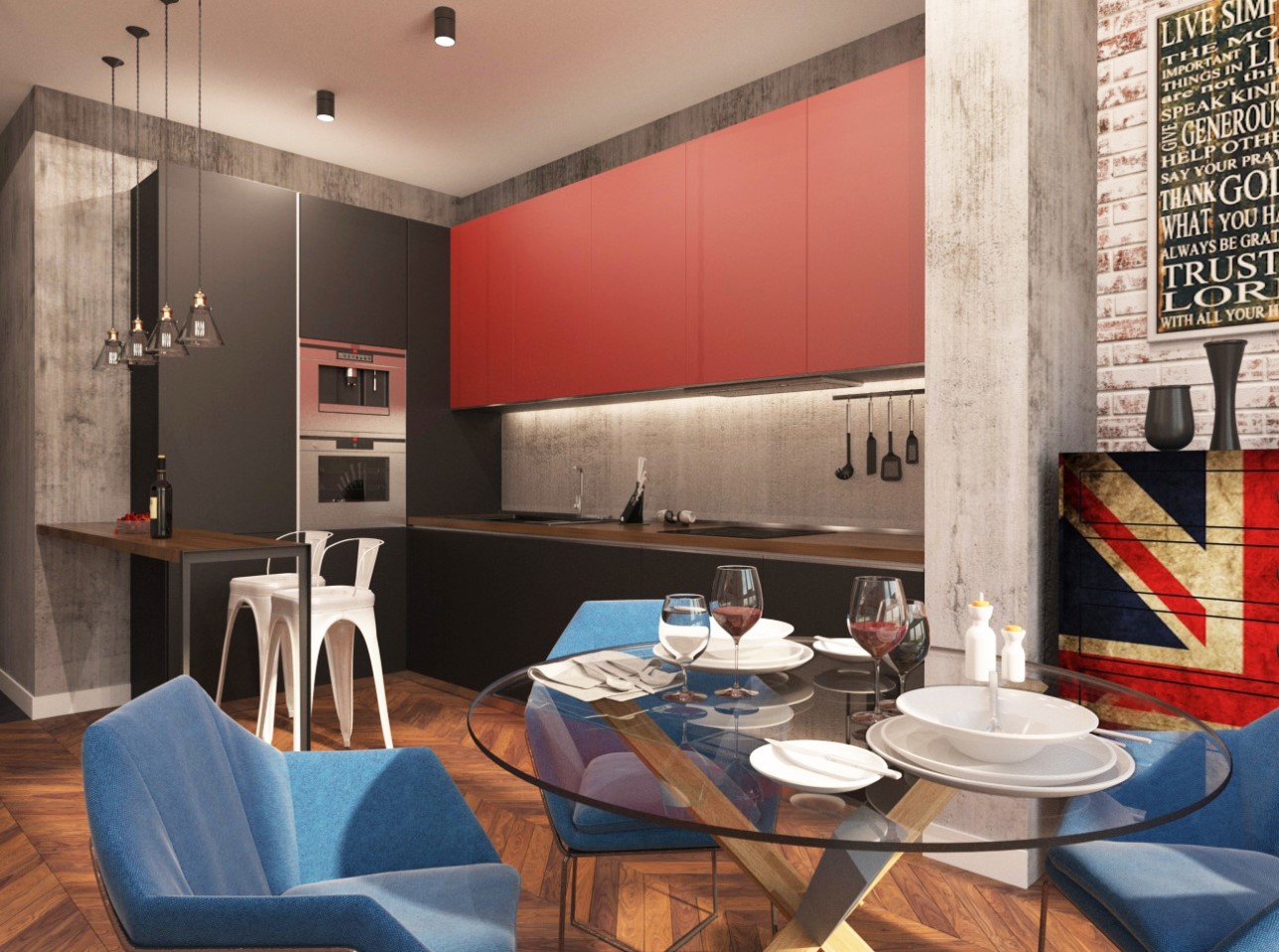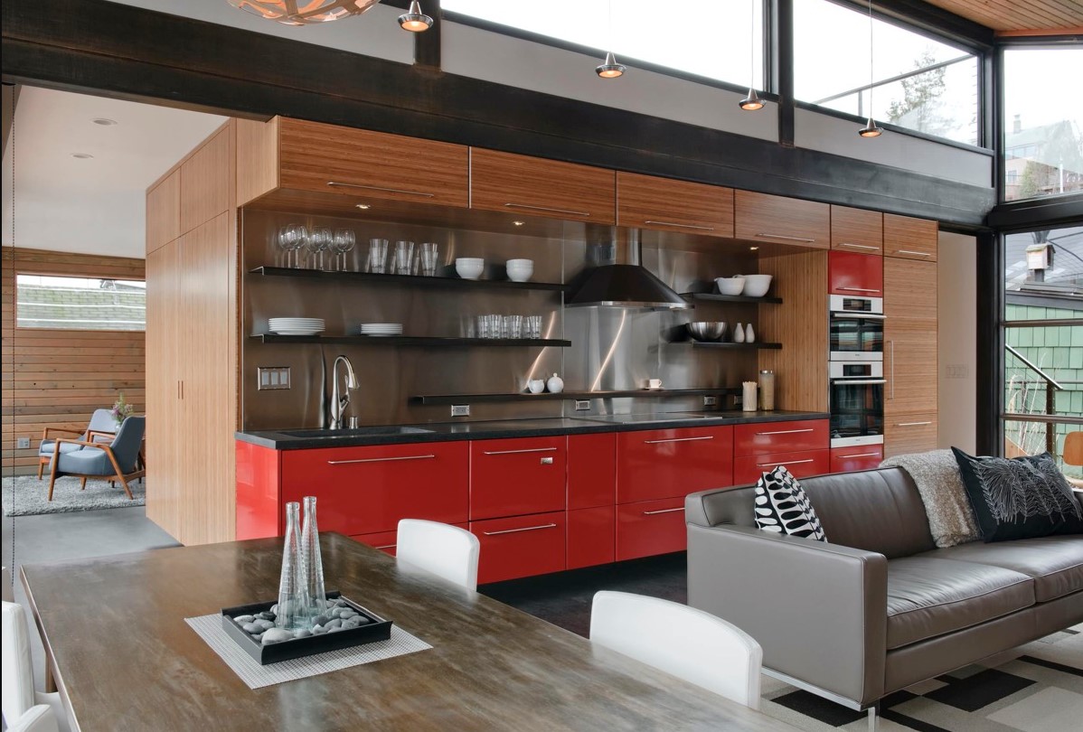 Кухня и гостиная обычно представляют одно целое после сноса межкомнатных стен. Расположение кухни — современное и энергичное. Самым важным здесь является игра цветов. Красная кухня доказывает, что хороший дизайн подойдет для любого интерьера.