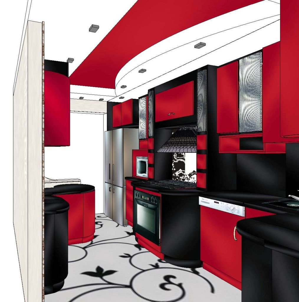 Дизайн просторной черно-красной кухни, особенно с окнами, выходящими на солнечную сторону, допустимо выполнять в достаточно темных тонах, практически не разбавляя их. Здесь черными иногда делают и пол, и стены, и даже потолок. Гарнитур выполняется красным, как и отдельные элементы стенового декора. Обратные варианты, когда фон полностью красный встречаются не реже.