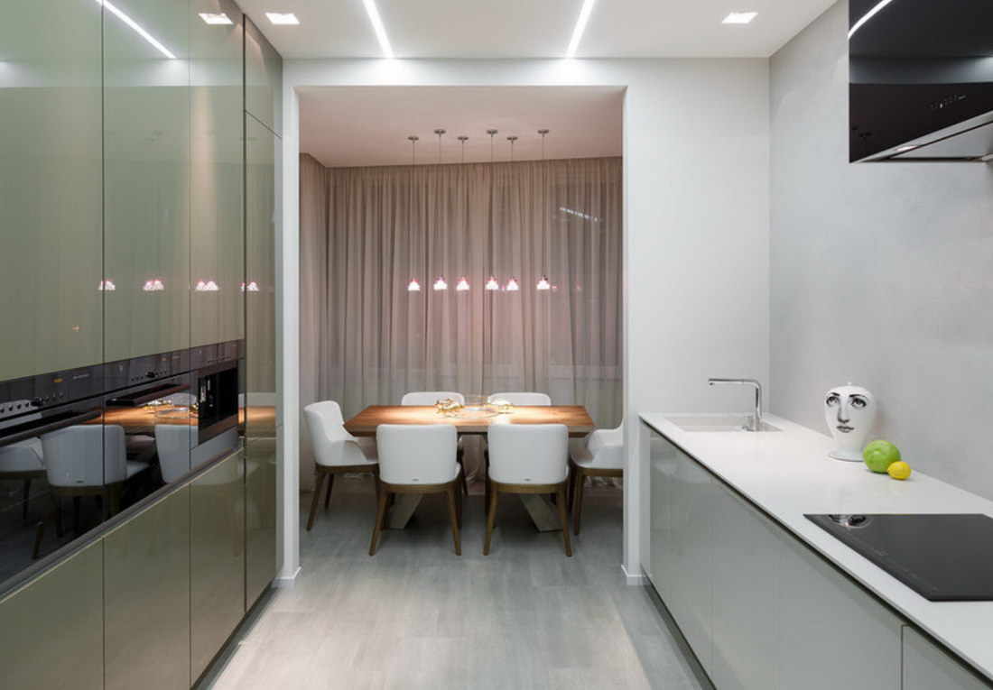 Раздвижные двери создадут ощущение разграничения пространства, но всё-таки оставят кухню максимально светлой. Раздвижные двери не занимают драгоценного места и позволяют без помех расположиться необходимой мебели;