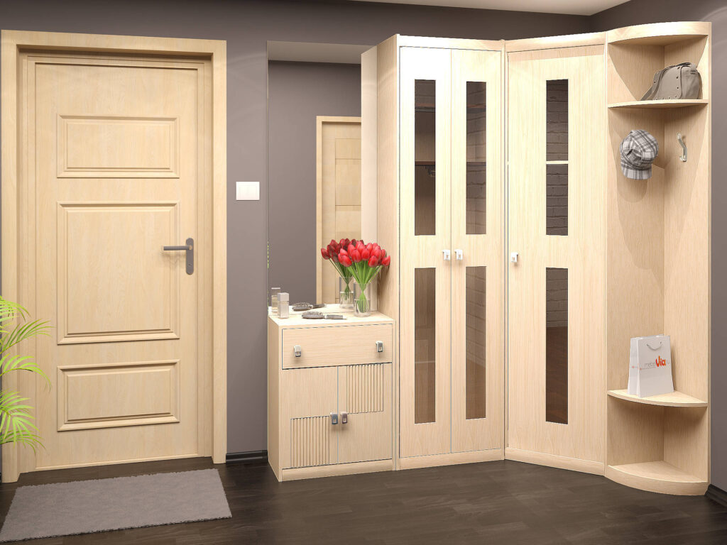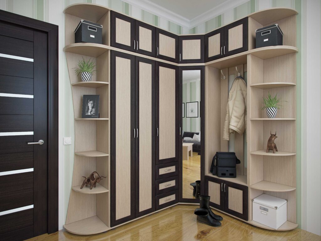 Оригинально разрешить проблему маленькой квадратной прихожей позволит шкаф, встроенный в угол. Таким образом, Вы сможете сэкономить на двух смежных стенках до 20% стоимости. Встроить такой шкаф не составит большого труда. Главное правило – это выбрать глубокий вместительный угол, с достаточным расстоянием от межкомнатных и входной дверей. В высоту гарнитур практически неограничен и может располагаться до самого потолка. Единственный нюанс – оставить небольшое расстояние в 50 миллиметров между верхней стенкой гардероба и натяжным потолком.