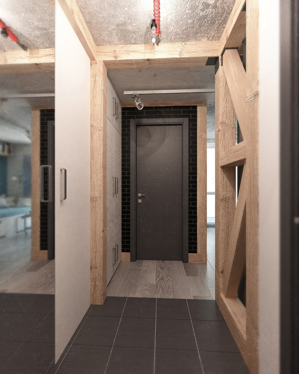 - Отсутствие отгороженной прихожей в квартире-студии. Квадрат из кафеля на полу у входа. Скамьи-лари по периметру и напольная вешалка из ствола дерева с сучьями.