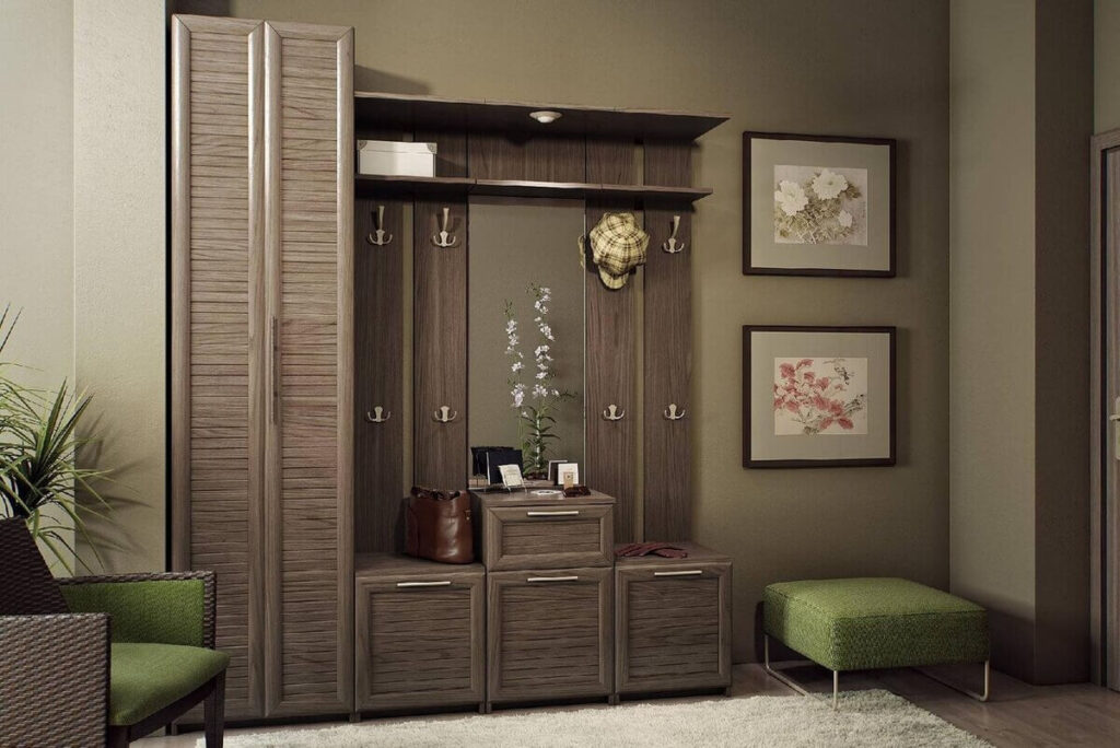 Прихожую небольших размеров можно оборудовать вешалкой. Она сможет заменить большую мебель при размещении верхней одежды. Для хранения вещей в прихожих частных домов часто используют тумбу или комод.