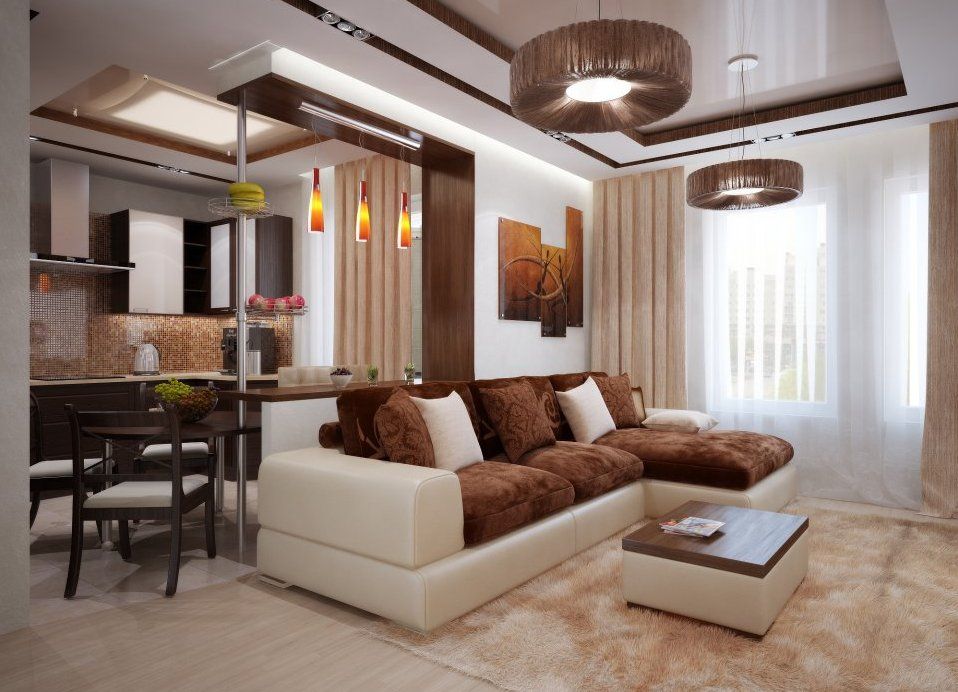 Бежевая кухня-гостиная с темно-коричневыми акцентами.