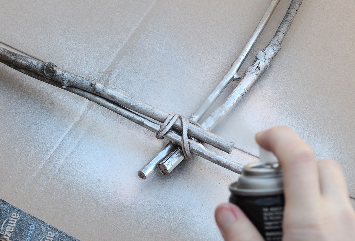 Теперь покрасьте все аэрозольной краской с помощью металлической аэрозольной краски. Я использовал яркий светоотражающий серебряный венок для своего венка, чтобы он контрастировал с золотыми и красными орнаментами.