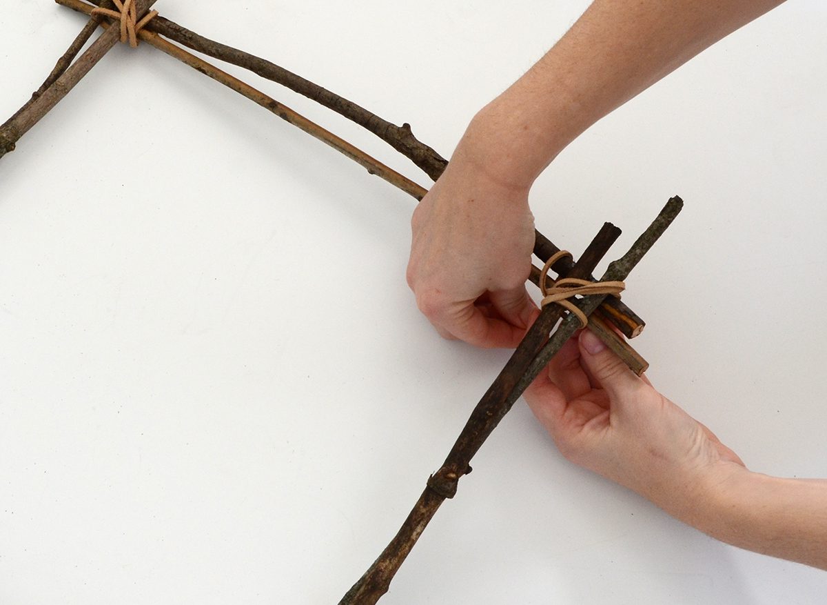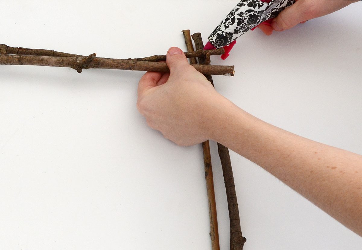 Начните с обрезки веток примерно до 16 дюймов в длину и уложите их в квадратную форму. Я использовал по 2 веточки с каждой стороны, потому что хотел получить простой и причудливый вид, но вы можете добавить больше, если хотите. Приклейте веточки друг к другу по углам, чтобы они были устойчивыми.