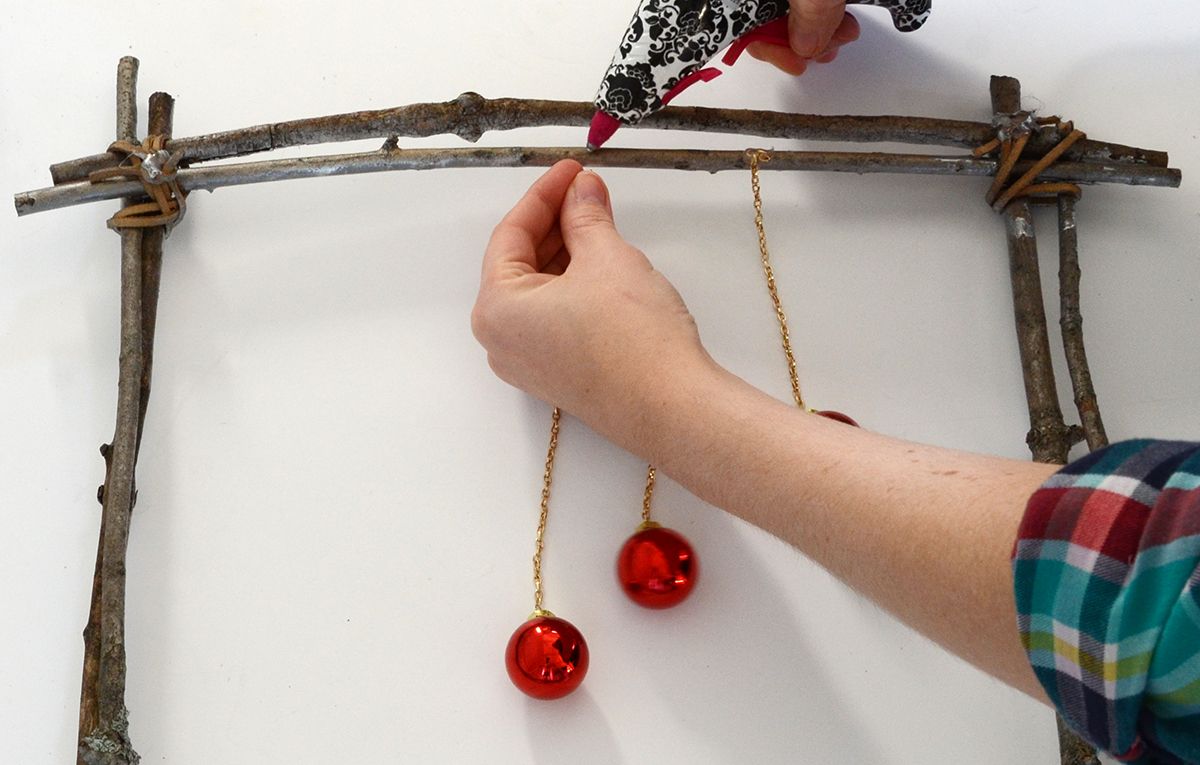 Переверните венок и приклейте концы цепочки к тыльной стороне веточек, как показано выше. Разместите их так, чтобы они были по центру квадрата.