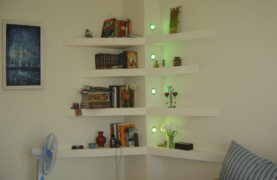 Выступ можно спрятать за полками из гипсокартона с декоративной подсветкой
