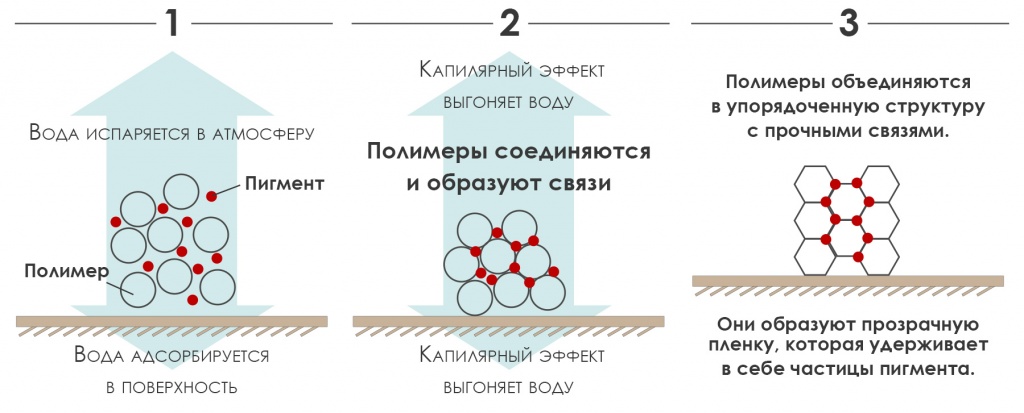 Носителем для основы в данном ЛКМ является вода, которая делает из акрилового полимера эмульсию. Краска высыхает благодаря испарению воды, но этот процесс происходит слишком быстро, поэтому в ЛКМ добавляются замедлители — вещества на основе глицерина или гликоля.