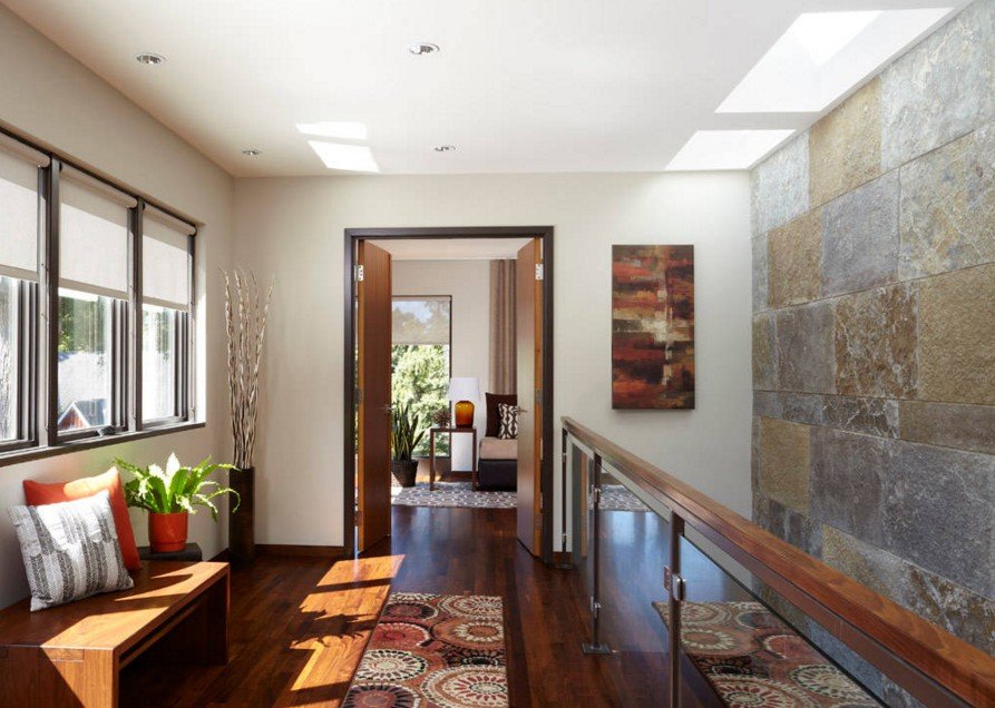 Традиционное решение — выложить пол камнем или керамической плиткой. Это очень удобно: такое покрытие легко мыть, оно не требует особого ухода, к тому же весьма долговечно. Декоративный искусственный камень в коридоре по внешним признакам ничуть не уступает натуральному, а по износостойкости и прочности порой даже превосходит его. Природный материал украсит ваш интерьер своим уникальным рисунком, а плитка создаст настроение.