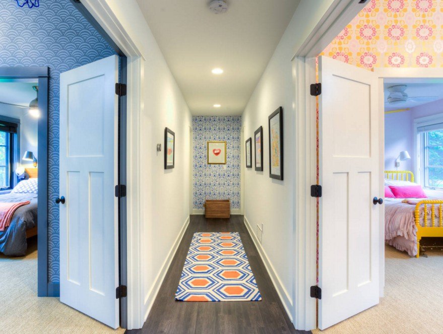 - Для коридора больше подходят однотонные обои. Но можно использовать и материал с принтом, чтобы скорректировать пропорции. Например, если коридор узкий, но длинный, стоит подобрать обои с вертикальными линиями. А варианты с горизонтальными бордюрами визуально удлинят стены.