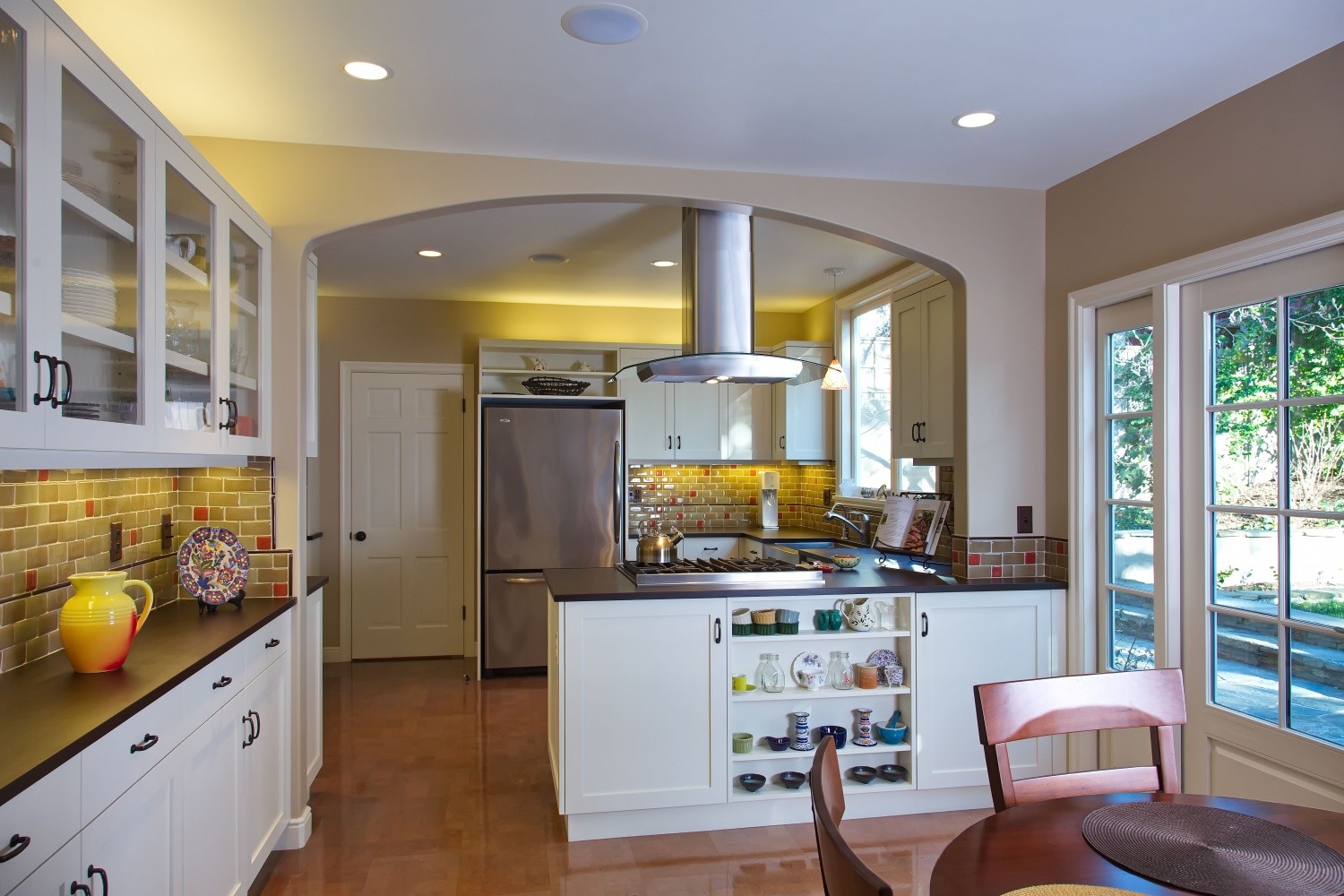 Первый шаг к тому, чтобы создать комнату, которая соединяет два смежных помещения, — сделать пространство более объемным и открытым посредством арки. Чтобы улучшить дизайн, вы можете открыть стены между кухней и гостиной, установив свод. Открывая стену и позволяя линиям обзора расширяться за пределы кухни, вы создаете ощущение большего пространства без затрат полезной площади.