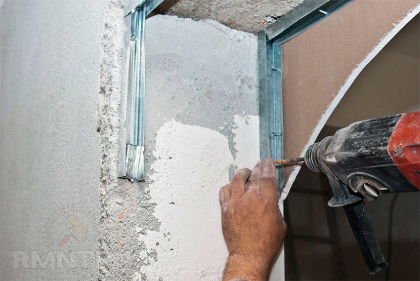 При помощи специальных ножниц нарезаются профиль нужного размера, которые будут крепиться к стене с обеих сторон проема. Так же нужно приготовить два отрезка равных ширине проема, и закрепить их сверху. Для того чтобы прикрутить профиль к бетонной или кирпичной стене используют дюбеля. Сначала перфоратором проделываются отверстия, в которые вставляется дюбельгвоздь, затем саморез вкручивают шуруповертом. Шаг крепежей должен равняться 15-20 см.