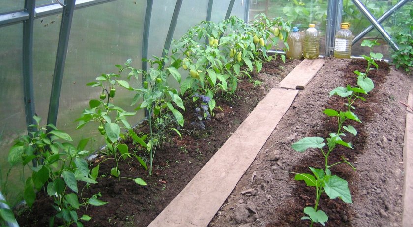Отличное решение увеличить совместимость овощей – зонировать пространство тепличного помещения. Для этого между перцем и огурцами надо натянуть ПЭ.