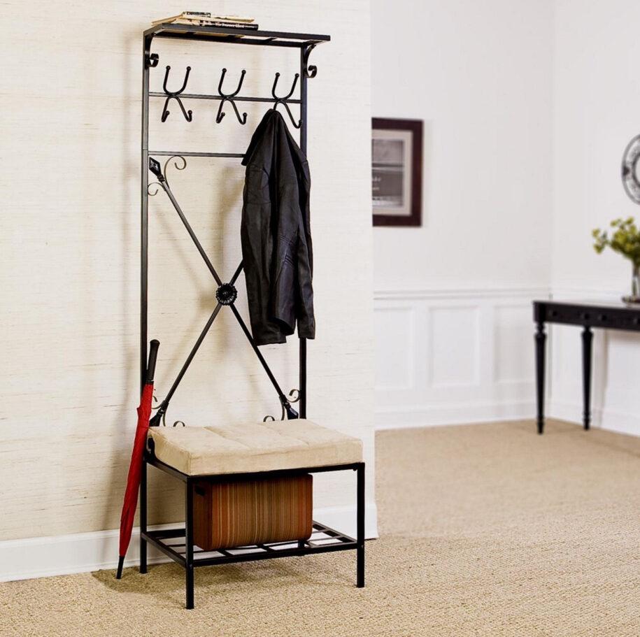 Функциональной мебелью, на наш взгляд, станет пуф, к которому присоединена вешалка. Это практичное изделие позволит гостям переобуться, а также повесить верхнюю одежду и головной убор. Когда вешалка и банкетка выполнены в едином стиле это всегда смотрится аккуратно и со вкусом.