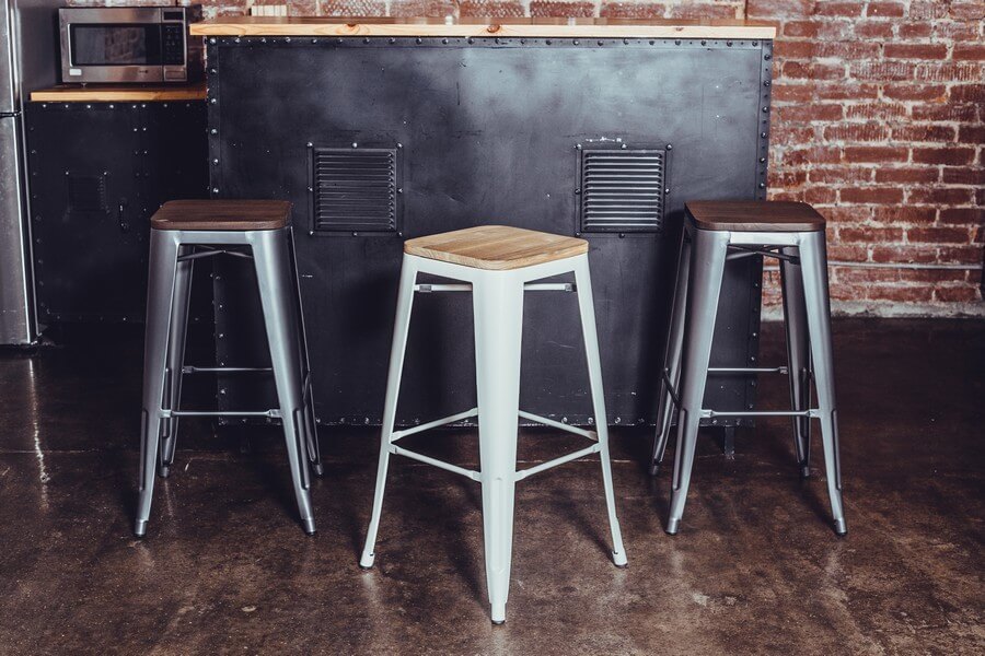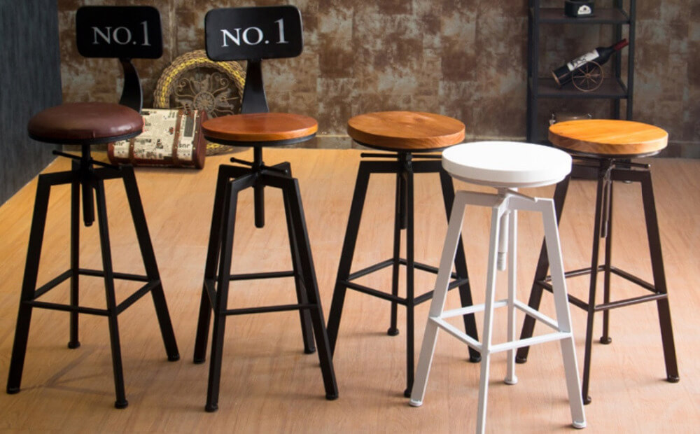 С металлическими каркасами – устойчивые, с подставками для ног, с сиденьями из дерева украсят помещение как в стиле кантри, так и обставленное классически.