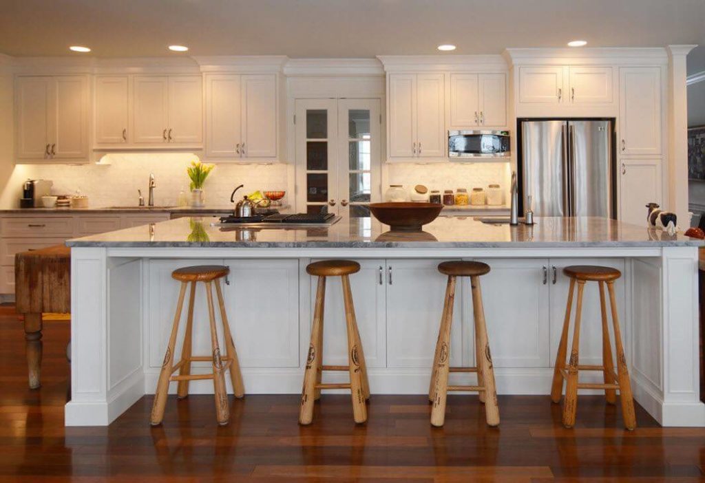 Деревянные высокие табуреты – их можно смастерить самостоятельно – с ножками из бейсбольных бит, подойдут любителям футбола – кухня превращается в спорт-бар, где с холодными напитками и снеками можно азартно болеть за любимую команду. Такая модель может сыграть роль достойного арт-объекта жилья.