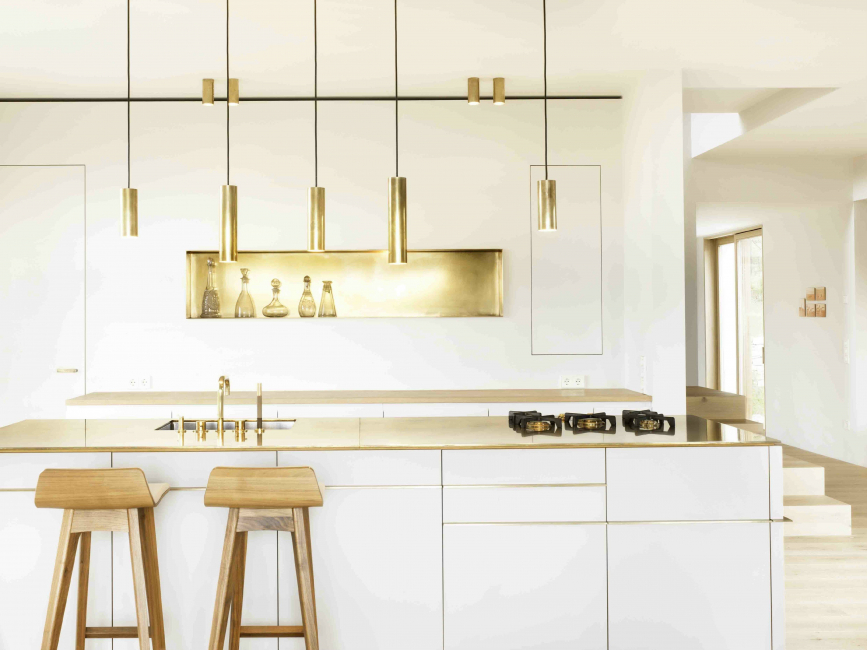 Обратить внимание при помощи золота можно и на фартук — особое место на кухне. Самый выигрышный вариант — использовать мозаику