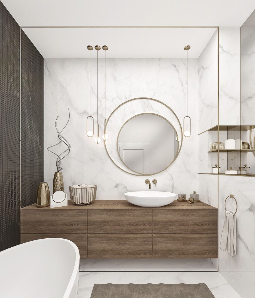 Блеск и сияние золотых элементов удастся подчеркнуть за счет светлого тона настенного покрытия. Выгодно смотрится в ванной комнате золотистые рамки зеркал, светильники и даже декор на кафеле подобного тона.