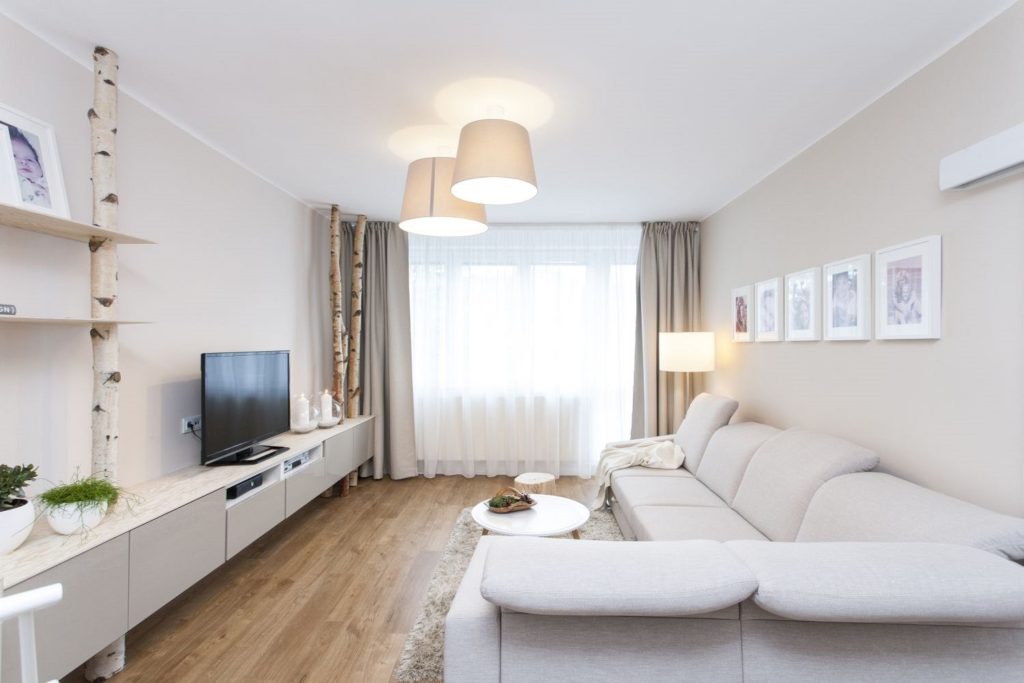 Если площадь гостиной меньше 15 квадратных метров, то в отделке недопустимы темные тона, обои с крупным принтом, плотные шторы и габаритная мебель. Все это визуально перегружает интерьер, делая гостиную неуютной