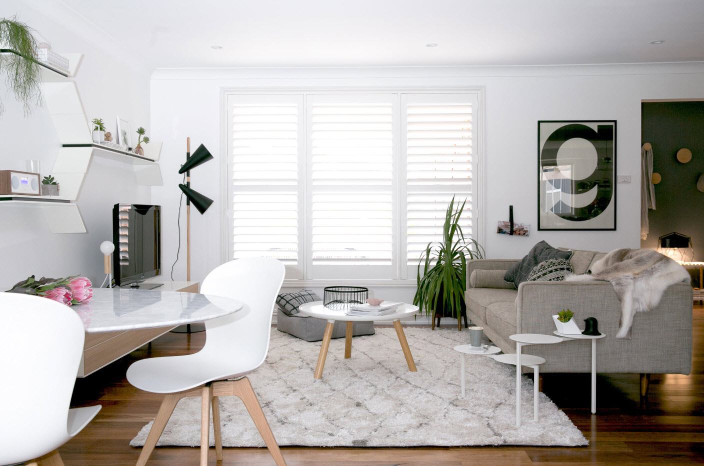 На фото гостиная комната в скандинавском стиле. Комната в белых тонах всегда будет выглядеть оригинально и стильно.