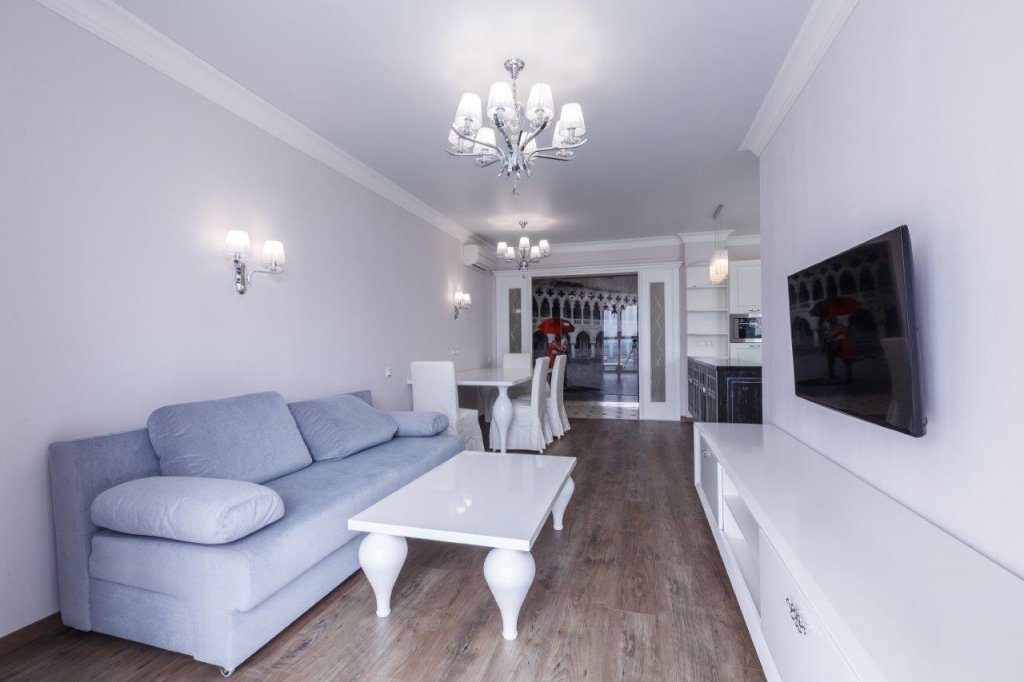 Сегодня популярно одно из направления классического стиля — неоклассика. При оформлении комнаты преобладает белый или бежевый цвет. Белая гостиная в современном стиле отличается наличием искусственных материалов, плотного текстиля, плавностью линий. Потолок часто делают натяжным с глянцевой поверхностью.