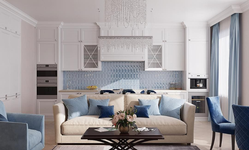 Хорошо смотрится изумрудно-зеленый, особенно, если он слегка «прозрачный». В таком тоне оформляют кухонный фартук, пол в рабочей зоне, часть потолка, подсветку гарнитура. Лазурно-голубой используется в тех же местах – на фартуке тогда изображают подводный мир или морской пейзаж.