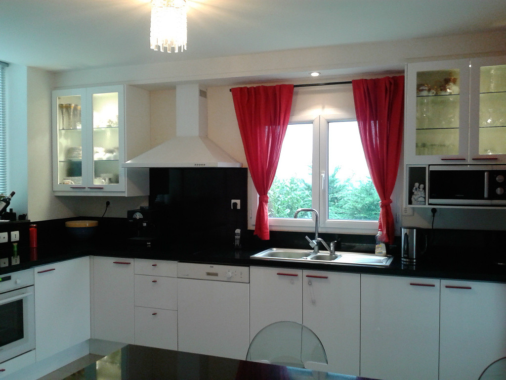 К примеру, отлично будет выглядеть сочетание белого гарнитура и красного фартука. Красными могут быть некоторые предметы мебели и бытовой техники — стулья, холодильник, микроволновая печь и т. д.